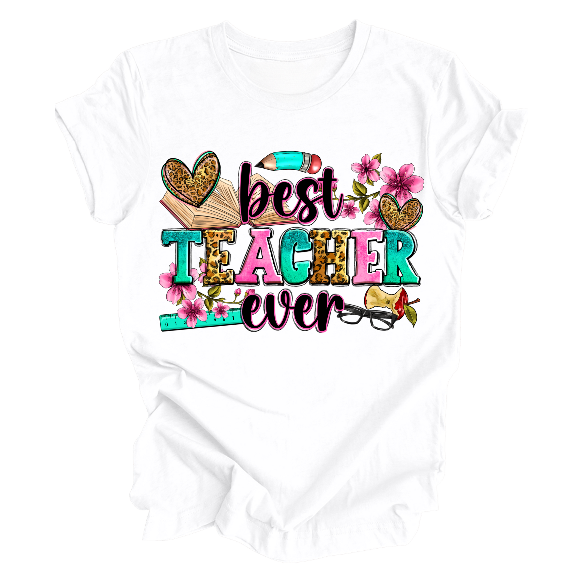 Show your appreciation in the most colorful way with this vibrant Best Teacher Ever t-shirt! Decorated with playful fonts, leopard print, flowers, and classroom icons, this tee is a fun and heartfelt way to honor your favorite educator. Available in white or black — perfect for gifting or rocking in the classroom!